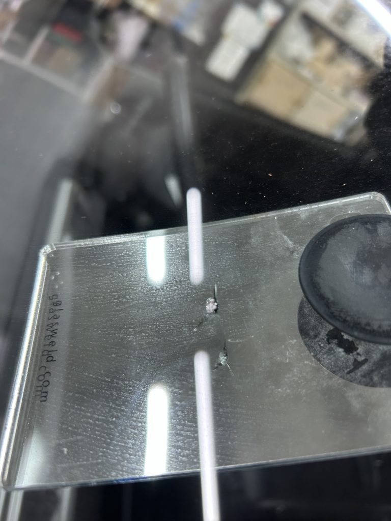 A. 物理的にガラスを一体化させるわけではないため、衝撃を受けた「衝撃点」は小さな跡としてわずかに残ります。しかし、ヒビ特有の「黒い影」はほぼ消え、強度はしっかりと回復します。
