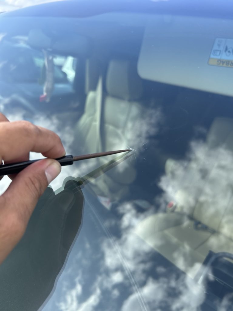 特にアルファードのような大面積ガラスは、走行時の風圧や段差での振動を受けやすく、さらに沖縄特有の激しい「熱応力(日光による膨張とエアコンによる収縮)」が加わります。放置すれば、早晩、修復不可能なレベルまでクラックが進展するリスクが高い状態となってます。