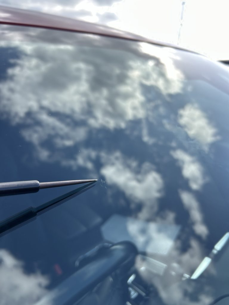 走行中に受けた飛び石の傷。特に中古車の新規登録や継続車検を控えている場合、その小さなヒビが「不適合(落検)」の決定打となります。
